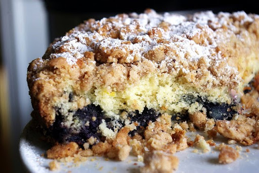 Butter and flour a 9-inch round baking pan and add your batter. Smooth it out with a spatula and top with your streusel mixture. Bake at 350 degrees for 40-50 minutes or until a fork comes out clean when inserted into the center of your cake. Allow your cake to cool and then transfer it to a cake stand and sift the top with confectioners sugar.
