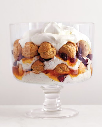 Assembly: Place chocolate pastry cream in a pastry bag fitted with a 1/4-inch plain tip (Ateco #801). Make a small hole in bottom of each choux puff with a paring knife. Insert pastry-bag tip into hole in each puff and squeeze bag until puffs are completely filled with pastry cream. (See Cook's Notes.) Spread half of ricotta cream in a 12-to-16-cup trifle bowl. Top with half of marmalade, then sprinkle with half of dried fruit and soaking liquid. Top with 15 cream puffs. Repeat layering with remaining ricotta cream, marmalade, dried fruit, and cream puffs. Top with whipped cream. Refrigerate at least 30 minutes and up to 4 hours before serving.
