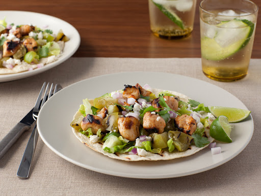 Grilled Chicken Tostadas al Carbon with Grilled Tomatillos and Queso Fresco
