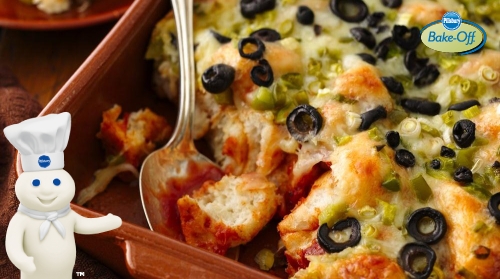 Separate dough into 13 biscuits; cut each biscuit into eighths. Place biscuit pieces in large bowl; toss with 1 3/4 cups salsa. Spoon evenly into margarine-coated dish. Sprinkle with cheese, bell pepper, onions and olives.