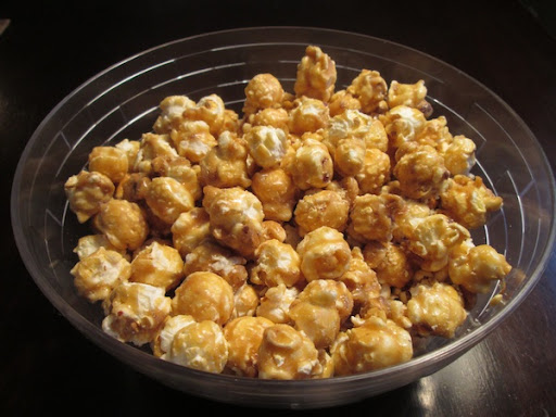 4. Pull the popcorn from the oven and, working quickly, pour the candy over the popcorn in thin streams. Mix the popcorn so that each kernel is coated with candy, put the popcorn back into the oven for five more minutes, then stir once again. This will help to coat each kernel. You can repeat this step once more if necessary to get all of the popcorn coated. Pour popcorn onto a large sheet of wax paper to cool. Spread the popcorn out, but be careful...it's hot.