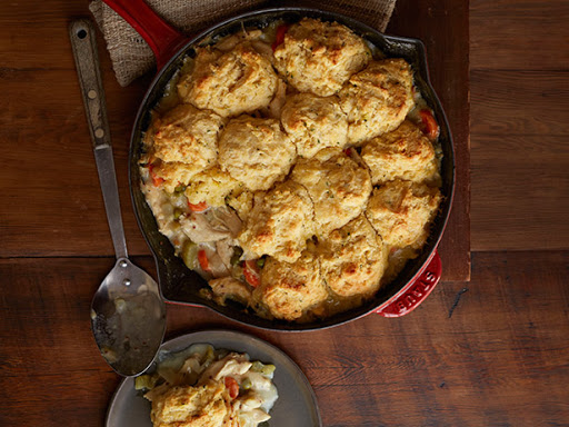Stir the peas into the turkey filling. Using a spoon, drop about 14 mounds of batter on top. Transfer the skillet to the oven and bake until the topping is puffed and golden, about 25 minutes. Let stand 5 minutes before serving.