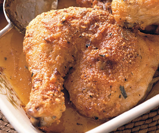 Bake, basting with the pan juices occasionally (tilt the pan and spoon the juices from the corners), until the chicken is well browned and cooked through, 50 to 60 minutes.