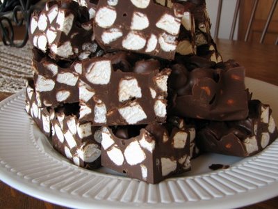 Melt chocolate gently. Stir in marshmallows and nuts. Spread in buttered pyrex. Let set.