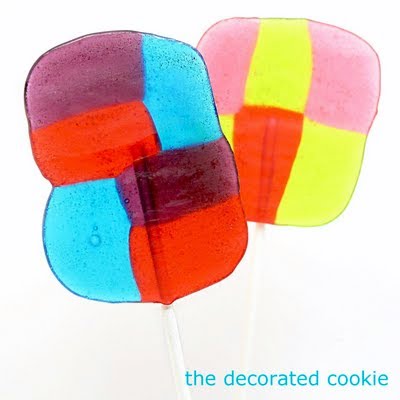 2. Arrange the crushed candies and whole candies 1/4- to 1/2-inch thick on the prepared baking sheet in varying shapes and sizes. Or, fill the inside of a metal cookie cutter with crushed candies for a more defined shape; carefully lift cutter from baking sheet before baking. Or arrange whole pieces of candy in varying designs and shapes. Make only three or four lollipops at a time; space them at least 2 inches apart on the baking sheet to allow room to insert the sticks after they bake.