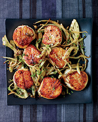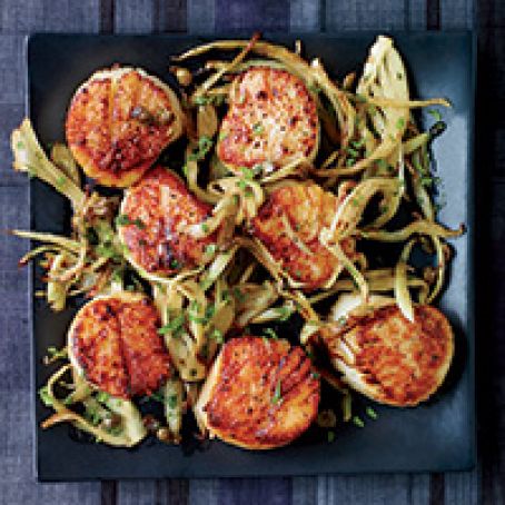 Melt the butter in the skillet. Add the sliced fennel and capers and cook over high heat, stirring, until the fennel is crisp-tender and lightly golden, 2 minutes. Stir in the lemon juice and parsley and season with salt and pepper. Spoon the fennel around the scallops and garnish with chopped fennel fronds. Serve with lemon wedges.