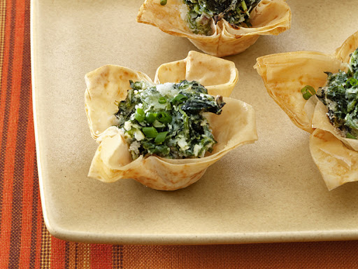 Beat the egg whites to stiff peaks and fold into the spinach filling. Spoon about 1 tablespoon filling into each phyllo cup and top with the remaining parmesan. Bake until the filling is set, 15 minutes. Cool slightly in the pan; remove and top with the chives.