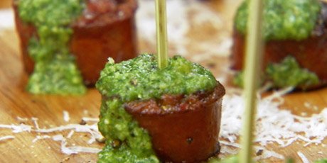 Add a dash of sherry vinegar to the pan Plate up with a dollop of arugula pesto. Add little cocktail sticks or toothpicks to each piece for easy eating.