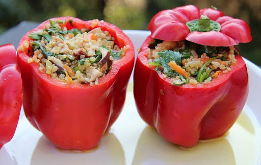 6. Divide quinoa mixture evenly among the 4 bell peppers. Top each pepper with its reserved top then arranges them upright in a glass-baking dish.