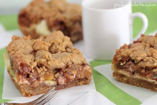 3. In another bowl mix the softened cream cheese and sugar until smooth then layer over peanut butter dough. Cut up chocolates and layer over cream cheese then top with remaining peanut butter cookie dough. Bake for 25-30 minutes or until cookie turns golden brown. Remove and let cool completely then cut into squares.
