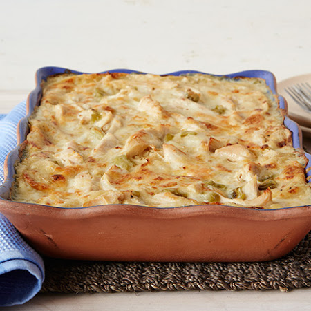 Spread 1 cup of the mixture into the prepared baking dish. Arrange a layer of 6 tortillas over the mixture, and then top with 1 cup shredded chicken and 1/2 cup of the Cheddar. Repeat this layer three more times, ending with cheese. Spread any remaining mixture over the cheese. Make sure all of the tortillas are covered or they will get very hard during baking. Bake uncovered for 30 minutes.