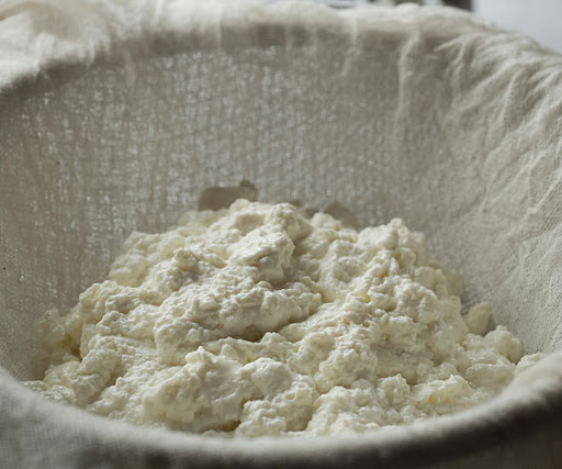 Lay a fine-meshed sieve over a large bowl or jar and line it with a double layer of damp cheesecloth. Using a large slotted spoon, scoop the curds into the cheesecloth. Let the cheese drain for 10 minutes, and if you like, sprinkle salt over the top of the curds.