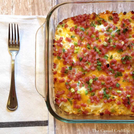 To make the night before simply Coat a 9" x 13" baking dish with cooking spray. Arrange the hash browns evenly in the bottom of the dish. Sprinkle with cheese, ham, and green onions.
