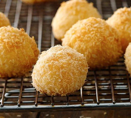 4 Place remaining 1/2 cup unsweetened coconut in shallow bowl. With moistened hands, firmly shape rounded tablespoonfuls of coconut mixture into balls; roll in unsweetened coconut to coat. Place 1 inch apart on cookie sheet.