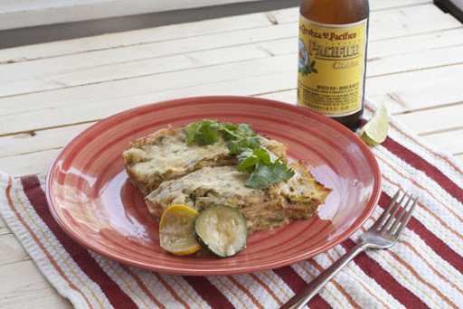 Repeat until you have crammed in as many enchiladas as you can fit and then pour the rest of the green chile sauce over the top.