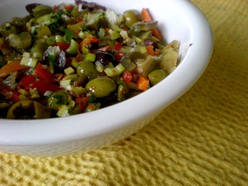 In a medium bowl, mix together the olives, garlic, capers, celery, Giardiniera, celery seed, oregano, basil, vinegar, olive oil. Correct seasoning with black pepper and salt. Transfer the mixture to a covered glass jar or other covered, nonreactive container; if needed, pour in more oil to cover the mixture, and refrigerate at least overnight.