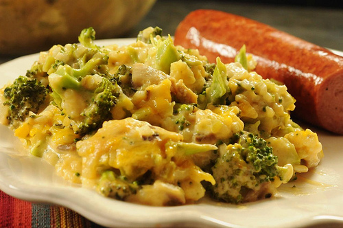 Stir the broccoli in the skillet and cook until it's tender-crisp, stirring occasionally. Stir in the milk, soup, cheese sauce and rice. Cook and stir until the cheese is melted. Pour the broccoli mixture into a 2-quart shallow baking dish.