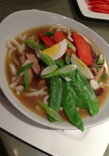 • 1 small carrot, peeled and sliced very thinly diagonally (we decided we'd leave this out altogether - texture issue)