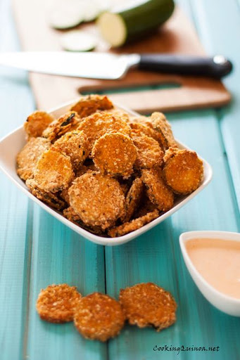 Dredge zucchini wedges in quinoa and cracker mixture. (Only a little bit will stick) Dip in milk mixture and then recoat with the quinoa mixture. Spray or brush with olive oil. Place on wire rack and bake for 20 to 25 minutes, until golden brown.