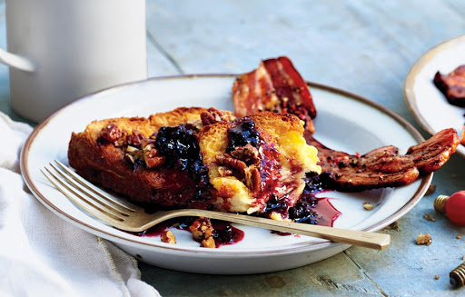 Scatter pecan crumble over soaked bread. Place dish on a rimmed baking sheet and cover tightly with foil. Bake until warmed through (a knife inserted into the center should feel warm to the touch), 25–30 minutes. Remove foil and bake until deeply browned, 35–40 minutes longer. Let cool slightly before serving with Blackberry Syrup.
