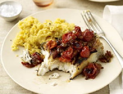 Halibut with Barbecue Tomato Sauce and Honey Mustard Polenta