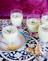 Working in batches, puree the soup in a blender until very smooth. Return the soup to the pan. Add the crème fraîche and bring to just a simmer over moderate heat, stirring occasionally. Season with salt. Ladle the soup into heatproof glasses or bowls. Garnish with the chives and pepper and serve.
