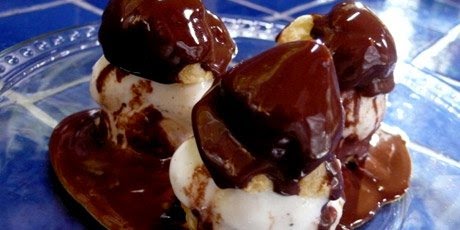 1. Slice the choux balls in half. Put a scoop of vanilla ice cream on the bottom half of each, then replace the tops. Arrange three on each serving plate, and drizzle over chocolate sauce to each person's liking.