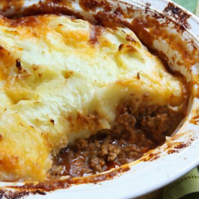 Transfer to a 9x13 casserole. Spread the mashed potatoes on top and dab with butter if desired. Bake at 350 degrees for about 30 minutes. Serve warm.