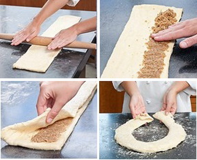 • Working with one piece of chilled dough at a time, follow these steps to roll and shape the kringle.