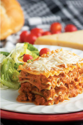 Arrange half of the lasagna noodles in a greased slow cooker. Spread half of the ground beef mixture over noodles. Top with half each of remaining ingredients except Parmesan cheese. Repeat layering process. Cover and cook on low setting for 5 hours.