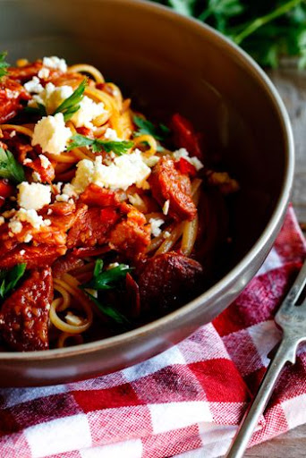 When the tomatoes are soft and the sauce has reduced, add the chorizo and bacon back to the pan and add the parsley. Season to taste.