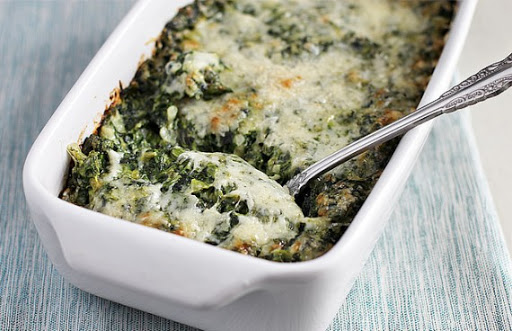 Transfer the spinach to a baking dish and sprinkle the remaining 1/2 cup Parmesan and the Gruyere on top. Bake for 20 minutes until hot and bubbly. Serve hot..
