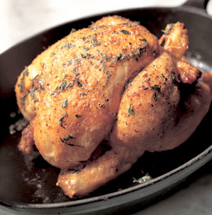 Place the chicken in a sauté pan or roasting pan and, when the oven is up to temperature, put the chicken in the oven. I leave it alone—I don't baste it, I don't add butter; you can if you wish, but I feel this creates steam, which I don't want. Roast it until it's done, 50 to 60 minutes. Remove it from the oven and add the thyme, if using, to the pan. Baste the chicken with the juices and thyme and let it rest for 15 minutes on a cutting board.