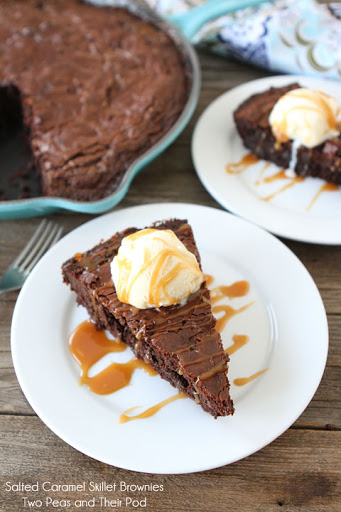 Fudgy skillet brownies with salted caramel swirled throughout! Top with ice cream and a drizzle of salted caramel and you will be in dessert heaven!