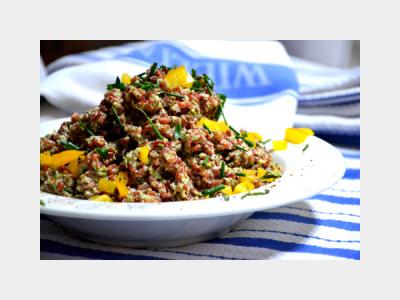 SERVE topped with additional pine nuts, diced yellow bell pepper and chives.