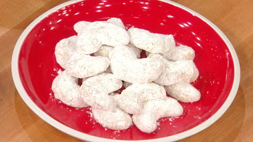 Shape the dough into 1-inch balls. Roll each ball slightly and form into half-moon or crescent. Arrange the shaped cookies, 2 inches apart on lightly greased cookie sheets. Bake for 15 minutes, until the edges are slightly browned but the tops are still pale. Transfer the cookies to a rack to cool.