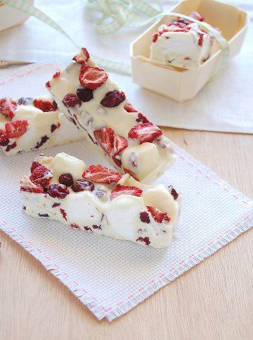 Place the chocolate in a heatproof bowl over a saucepan of barely simmering water – do not let the bottom of the bowl touch the water – and cook until chocolate is melted and smooth. Remove from the heat, add the marshmallow, dried apples and cranberries – keep some of the cranberries for decoration – and stir until well combined. Pour mixture into prepared pan and smooth the top. Sprinkle with the dried strawberries and reserved cranberries. Set aside until firm, 2-3 hours (the recipe calls for placing the pan in the refrigerator but I chose not to).