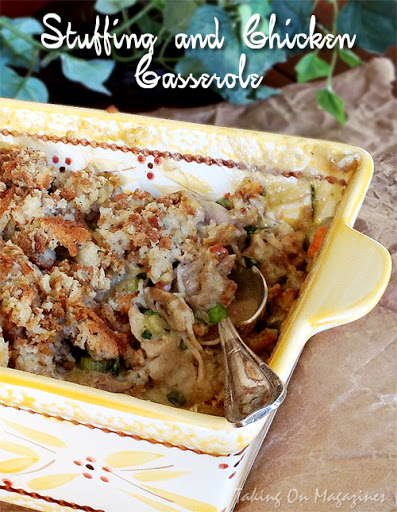 Measure out the stuffing into a large bowl. Add the chicken stock, stir to mix and let sit for 5 minutes. Spoon the stuffing over the filling, being sure to cover everything, then drizzle the stuffing with the melted butter.