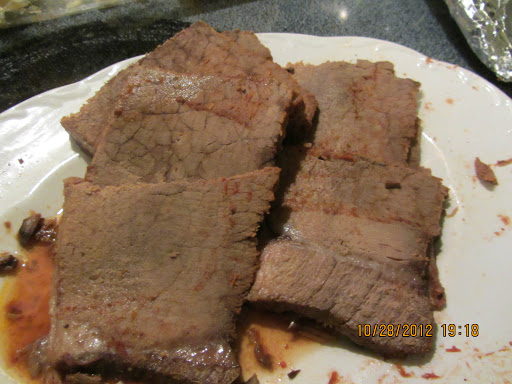 Cover and cook on low setting for 7 to 8 hours, or until fork-tender. Slice and serve topped with sauce and vegetables.