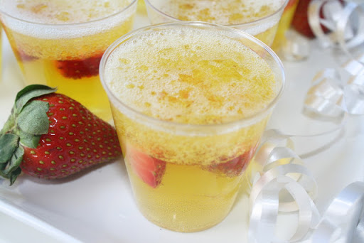 A fun way to serve bubbly at your New Year's Eve party. This is a recipe where you want to use $10 champagne- not your $40 bottle. The pineapple Jello has a mild flavor and compliments champagne. If you cannot find strawberries, use frozen or another seasonal fruit. Champagne Jello shots are an unexpected but tasty way to bring in the new year.