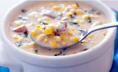 Be careful to remove only the part of the corn kernel sticking out of the cob; cutting deeper will pull off fibrous material. Yukon gold potatoes can be substituted for the red potatoes, minced chives for the basil. Depending on the sweetness of your corn, the finished chowder may need to be seasoned with sugar.