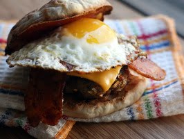 Build the burgers by placing each cooked patty on the English muffin bottoms. Top with the crisped bacon and fried eggs. Smear the tops of the English muffins with the Spicy Ketchup and place on top of the other ingredients. Serve immediately.