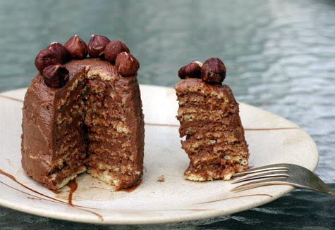 Divide the buttercream into six equal parts. Place a dab of chocolate buttercream on the middle of a 7 1/2” cardboard round and top with one cake layer. Spread the layer with one part of the chocolate icing. Repeat with 4 more cake layers. Spread the remaining icing on the sides of the cake. Optionally, press the finely chopped hazelnuts onto the sides of the cake. Propping a hazelnut under each wedge so that it sits at an angle, arrange the wedges on top of the cake in a spoke pattern. If you have any leftover buttercream, you can pipe rosettes under each hazelnut or a large rosette in the centre of the cake. Refrigerate the cake under a cake dome until the icing is set, about 2 hours. Let slices come to room temperature for the best possible flavour.