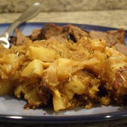 1.In a large skillet or saucepan, saute onion and garlic in oil until tender. Add potatoes, seasoned salt, pepper and lemon peel. Remove from the heat. Spoon half into a greased 1-1/2-qt. baking dish. Sprinkle with 1 cup cheese. Repeat layers. Combine bread crumbs, butter and rosemary; sprinkle over cheese. Cover and bake at 400 degrees F for 40 minutes. Uncover and bake 20 minutes longer or until potatoes are tender.