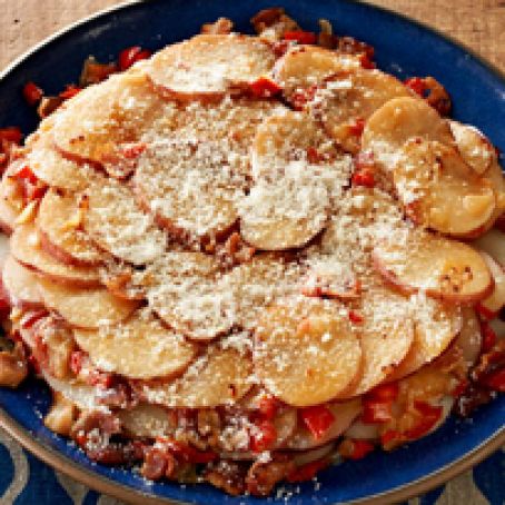 ADD water to skillet. Arrange 2 cups potatoes on bottom of skillet; top with layers of half each of the onion mixture and bacon. Repeat all layers. Top with remaining potatoes; cover.