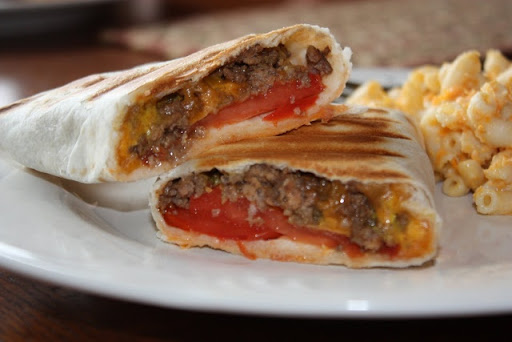 Brown ground beef in large skillet and drain. Add Worcestershire sauce, ketchup, dried onion, and salt and pepper to the beef and simmer for 5 minutes. Sprinkle shredded cheese down center of each tortilla. Add a few heaping tablespoons of the beef mixture on top of the cheese. Spread some mustard on top of the beef along with some slices of tomato. Roll up tortilla burrito-style and place wraps on preheated indoor grill (like a George Foreman).