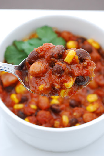 2. Add all remaining ingredients except for corn and cilantro. Bring to a boil, then cook uncovered on medium-low heat for about 45 minutes allowing the flavours to come together. Stir occasionally.
