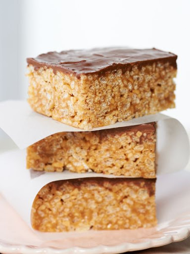 3. To prepare the topping, melt the butterscotch and chocolate chips in a small saucepan over low heat and spread the mixture over the rice-cereal mixture. Cool until the topping is set, then cut into squares.