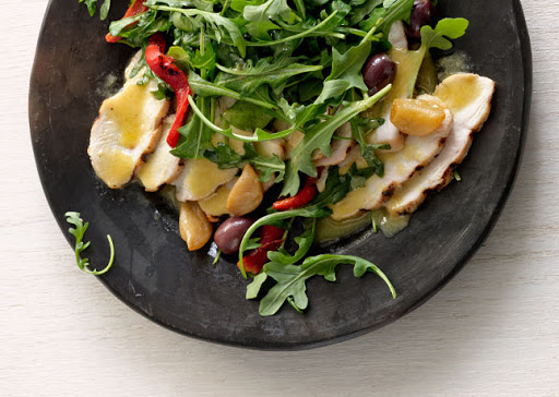 Purée 8 garlic cloves, 1/2 cup garlic oil, Dijon mustard, and vinegar in a blender or mini-processor. Season dressing with salt and pepper. Place remaining garlic cloves, olives, and remaining ingredients in a large bowl (cover and chill remaining oil for another use). Slice chicken on a diagonal; add to bowl. Spoon 2 Tbsp. dressing over; toss. Serve with remaining dressing.