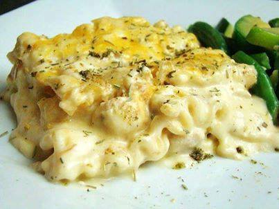Layer half of lasagna noodles, poultry sauce, and cheese in well-buttered 9×13 pan. Repeat layers again.